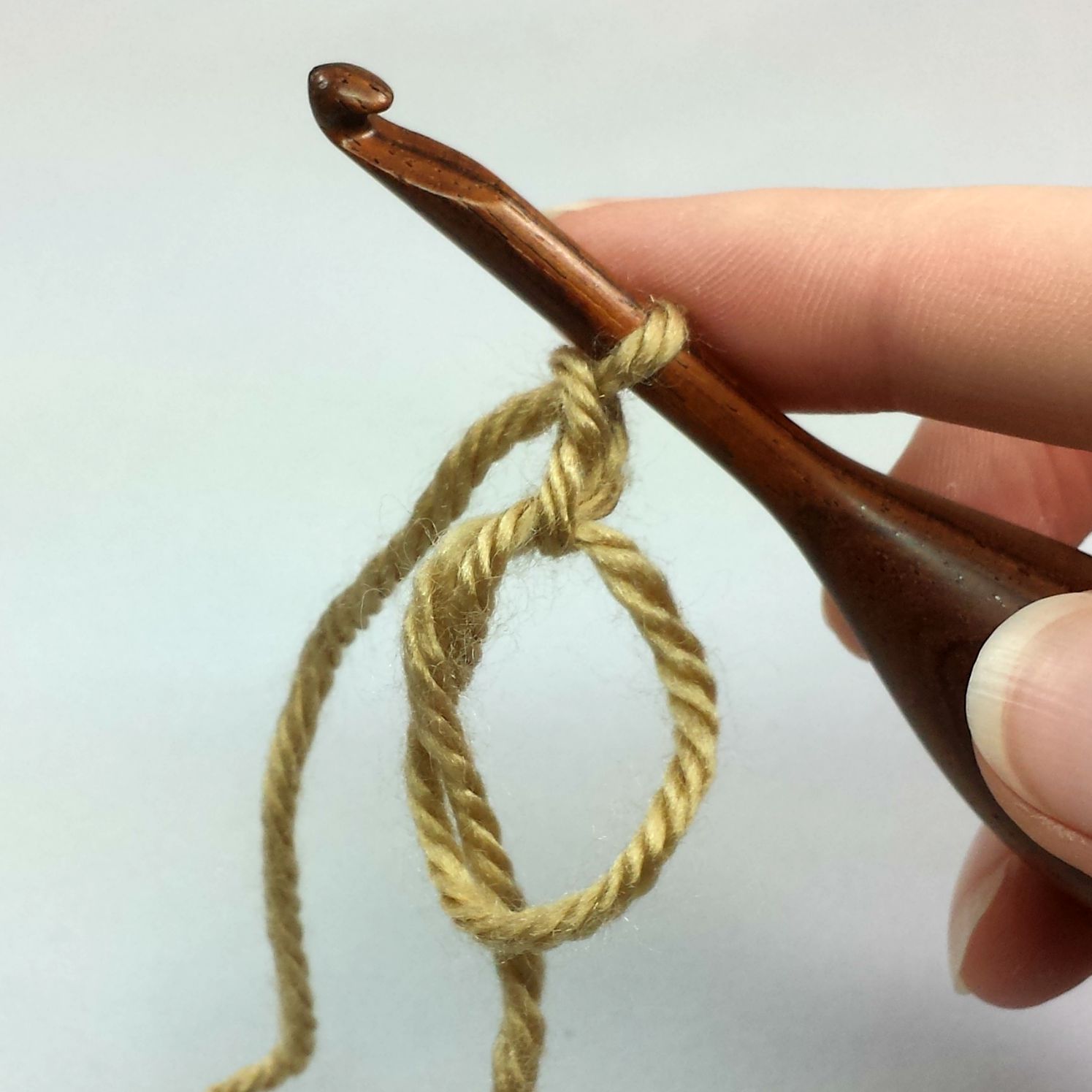 Start with the tail of the yarn in your hand, wrap the yarn around two fingers and cross over the tail. Holding the tail with your thumb, turn your hand over. Using your crochet hook, go under the first strand (tail) and grab the second strand (working yarn), pulling it under and through the first one (tail).
