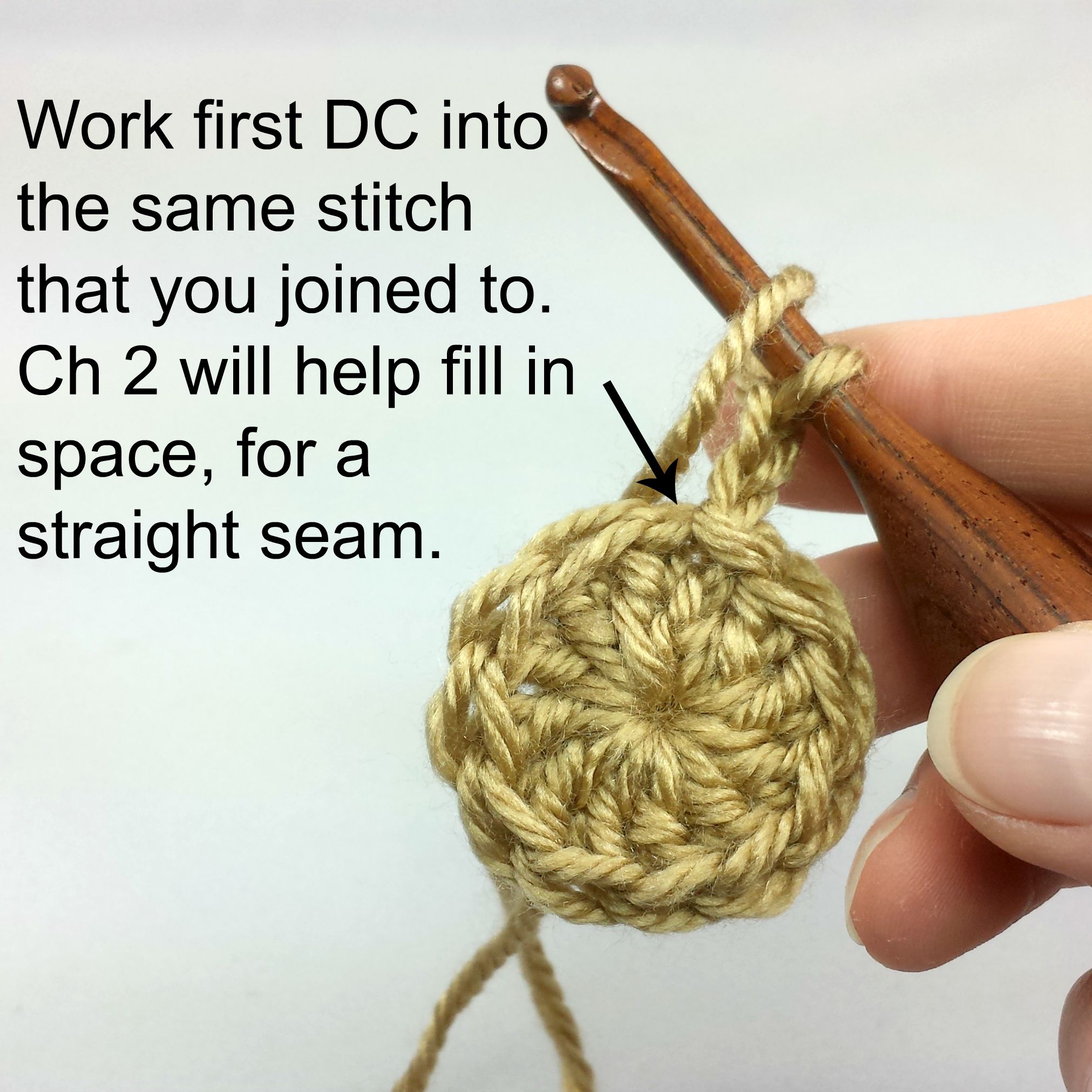 When I finish the round, I join to the first DC, with a slip stitch (SLST). That finishes round two and I continue to use this method each round, so my seam will stay straighter.  (Ch 2, work first DC into same stitch that you joined to, and join to first DC)
